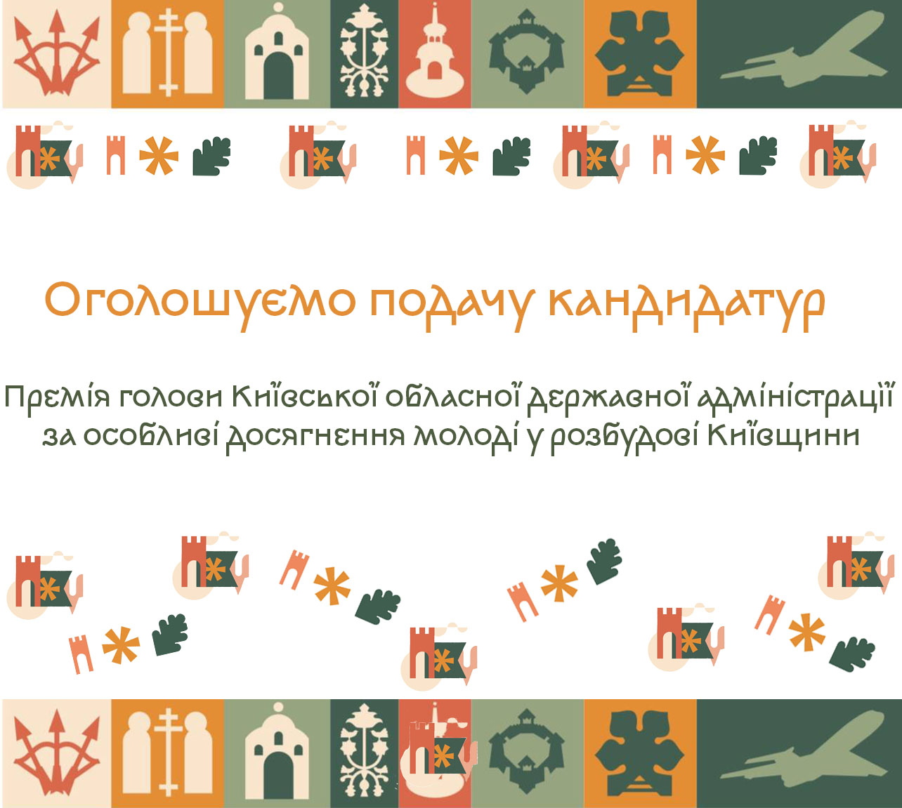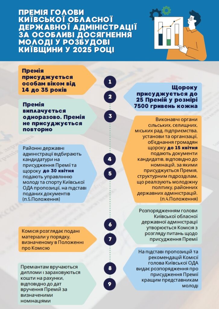 На виконання розпорядження Київської обласної державної адміністрації від 11 травня 2021 року № 269 «Про премію голови Київської обласної державної адміністрації за особливі досягнення молоді у розбудові Київщини», для відзначення кращих представників молоді Київщини просимо подати кандидатури із числа молоді, які досягли значних успіхів у 2024 році, до визначних дат та у таких номінаціях: