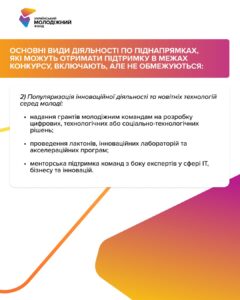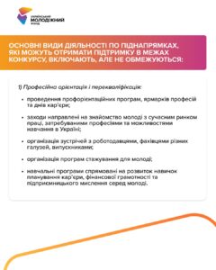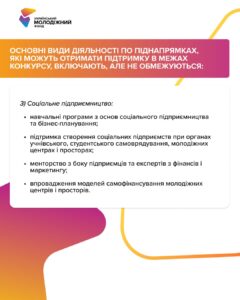 освітні програми з підприємництва, підтримка створення соціальних ініціатив у молодіжних центрах, менторство від підприємців, впровадження моделей самофінансування.