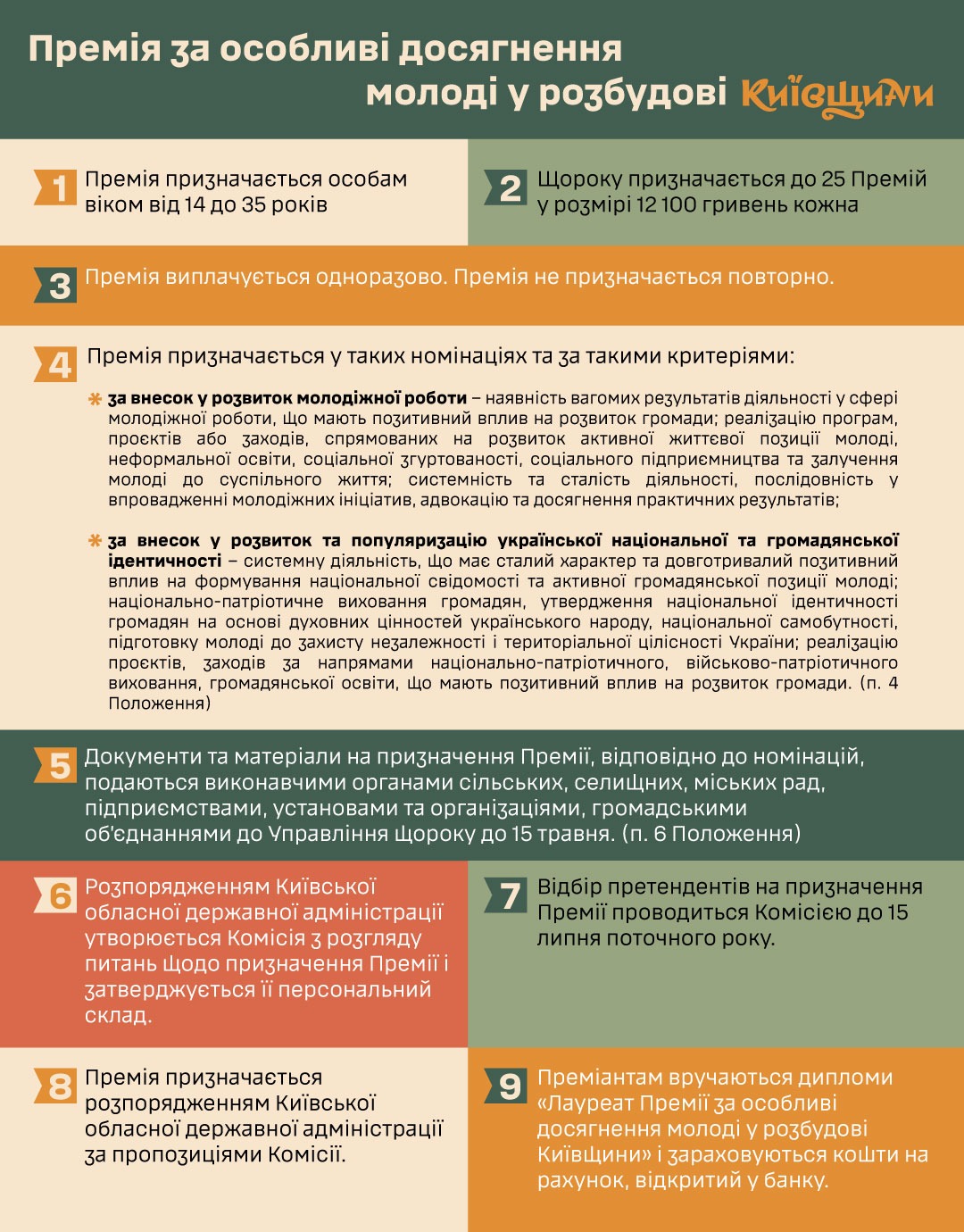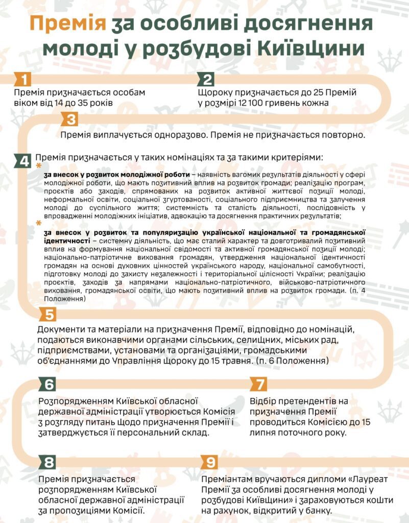 На виконання розпорядження Київської обласної державної адміністрації від 16 квітня 2026 року № 720 «Про Премію за особливі досягнення молоді у розбудові Київщини», для відзначення кращих представників молоді Київської області просимо поінформувати зацікавлених суб’єктів та із числа молоді віком від 14 до 35 років, які досягли значних успіхів у 2025 році у таких номінаціях та за такими критеріями: